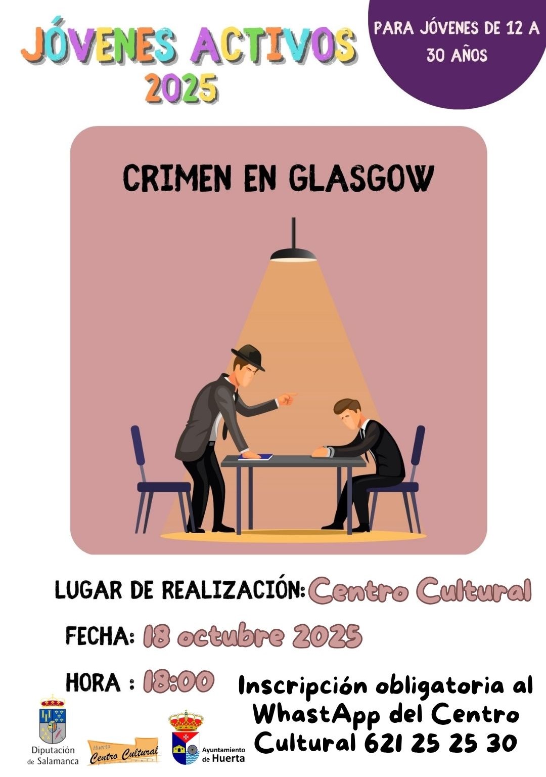 🔍Cluedo: Crimen en Glasgow🔎 para jóvenes de 12 a 30 años. 📲 Inscripción obligatoria antes del 15 de octubre. Plazas limitadas. 📆 18 de octubre 🕕 18h 📍 en el Centro Cultural de Huerta