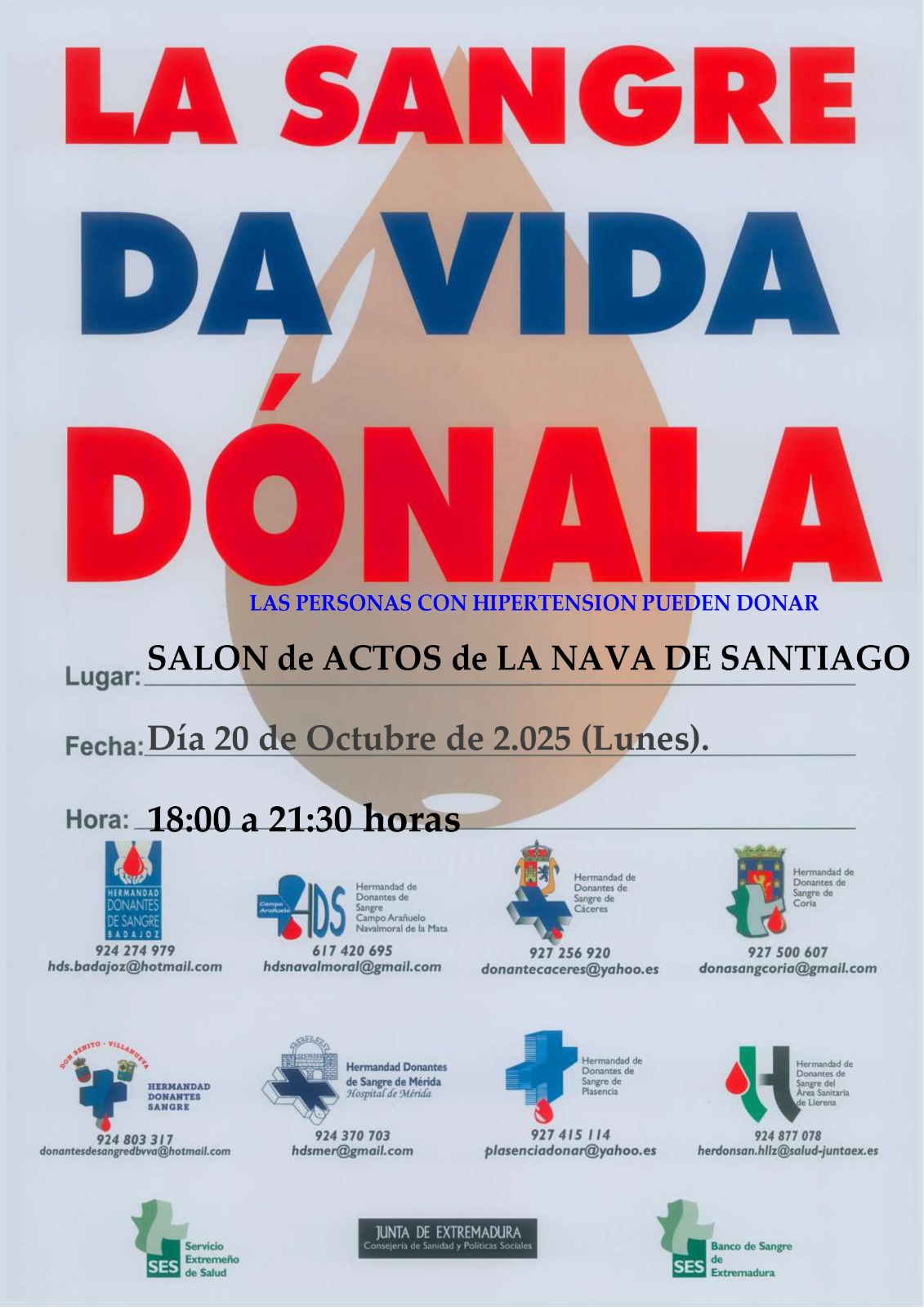 Se informa que un equipo del Banco de Sangre de Extremadura tiene previsto desplazarse a nuestra localidad el próximo lunes 20 de octubre, para atender a todas aquellas personas que generosamente quieran donar sangre: