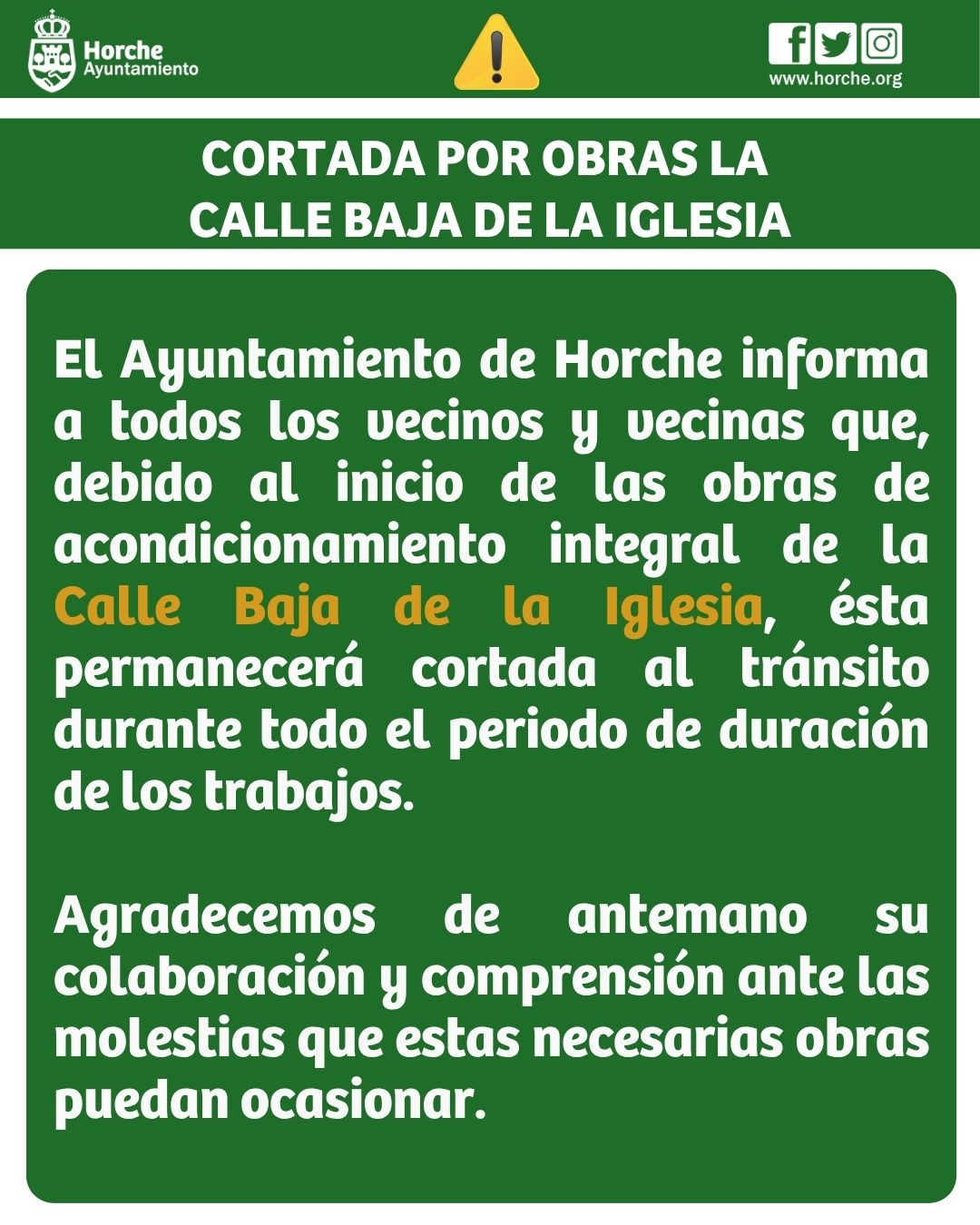 El Ayuntamiento de Horche informa a todos los vecinos y vecinas que, debido al inicio de las obras de acondicionamiento integral de la Calle Baja de la Iglesia, ésta permanecerá cortada al tránsito durante todo el periodo de duración de los trabajos.