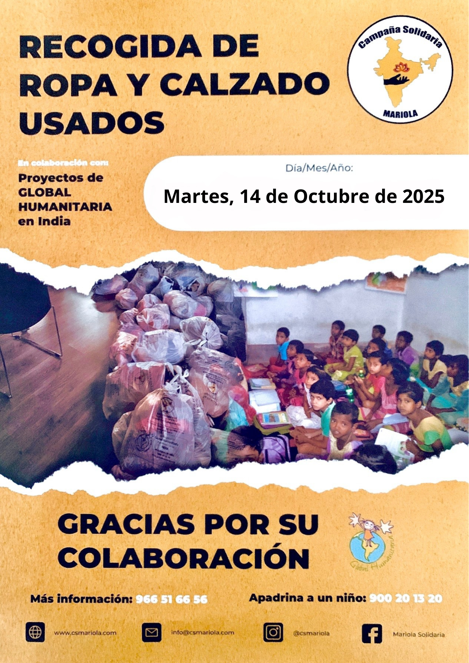 Desde la ONG Mariola Solidaria se solicita ayuda a través de una nueva campaña de recogida de ropa y calzado usados en el Colegio Público “Virgen del Arrabal”. Aquellas personas que deseen colaborar pueden traer al colegio bolsas con prendas de vestir y zapatos usados en buen estado hasta el 14 de octubre de 2025.