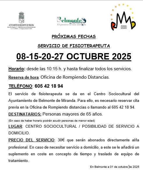 Servicio de Fisioterapeuta para el mes de OCTUBRE.Solicita cita con antelación en el teléfono: 605 42 18 94.
