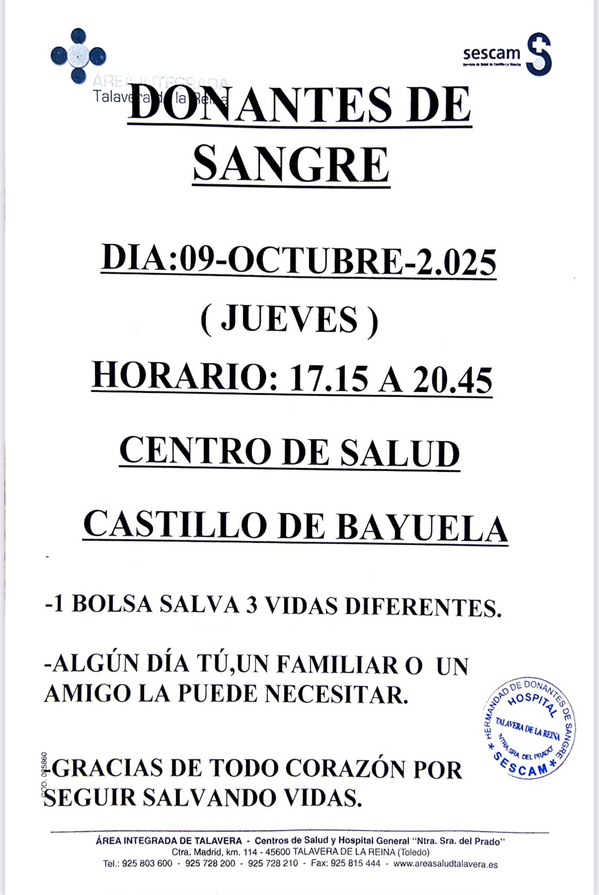 La Hermandad de donantes de sangre de Talavera y Comarca, quería comentarte que si puedes y quieres, te esperamos el próximo jueves día 9 de Octubre de 17.15 a 20.45 en el Centro de Salud de Castillo de Bayuela para donar sangre.