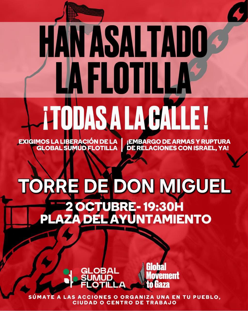 Hoy, 2 de octubre, jueves, se ha convocado una concentración pacífica de vecinos en apoyo a la Global Sumud Flotilla, la embarcación civil (o grupo de embarcaciones) que tiene como objetivo llevar a la Franja de Gaza ayuda humanitaria, tras haber sido detenida por las autoridades israelíes.