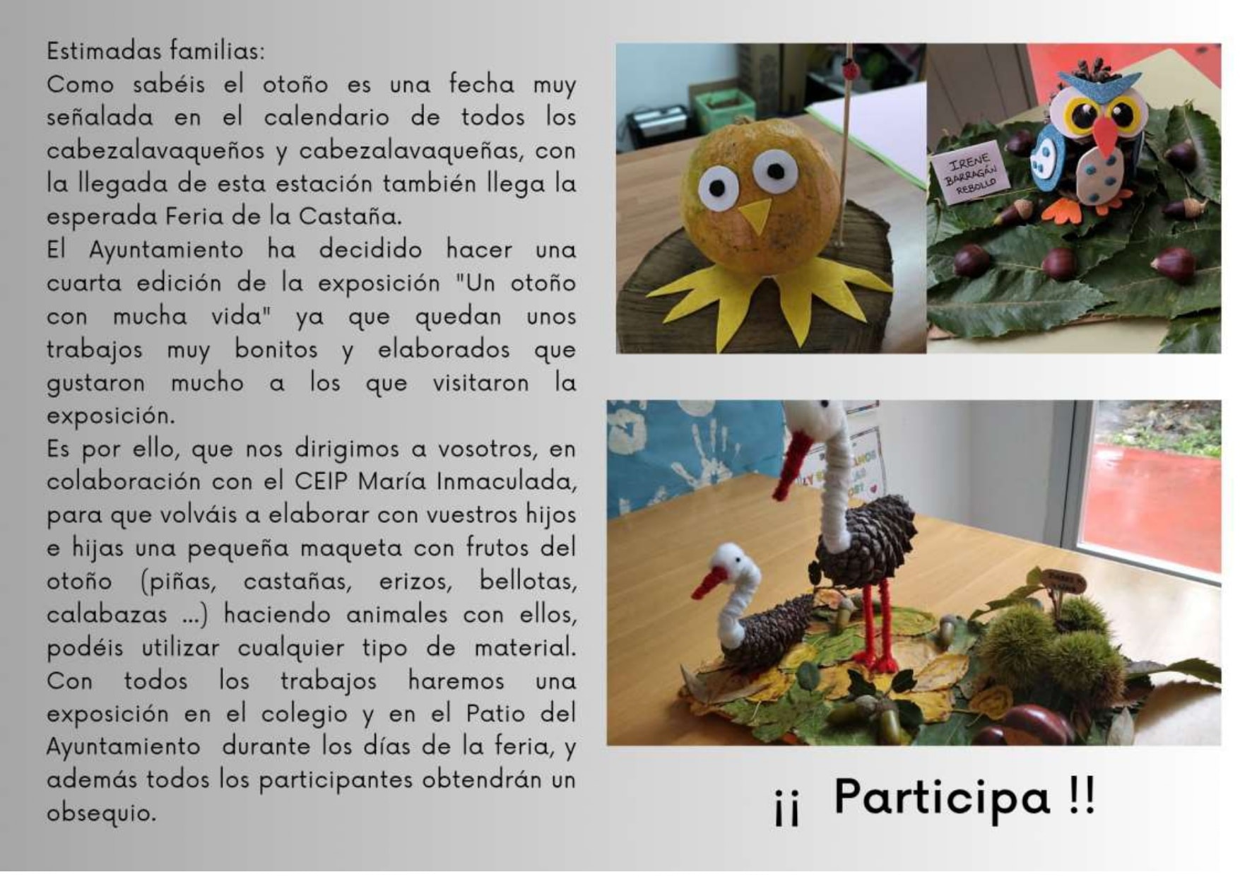 Con la llegada del otoño y la XX Feria de la Castaña, invitamos a todas las familias a participar en esta bonita iniciativa en colaboración con el CEIP María Inmaculada.