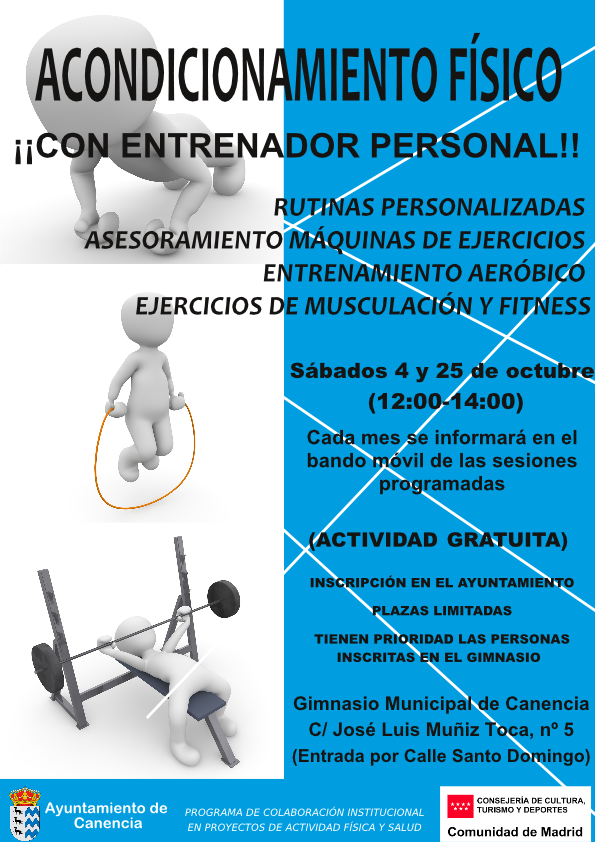 Sábado 4 y sábado 25 de Octubre de 12:00 a 14:00 horas.Actividad gratuita. Prioridad inscritos en el Gimnasio.