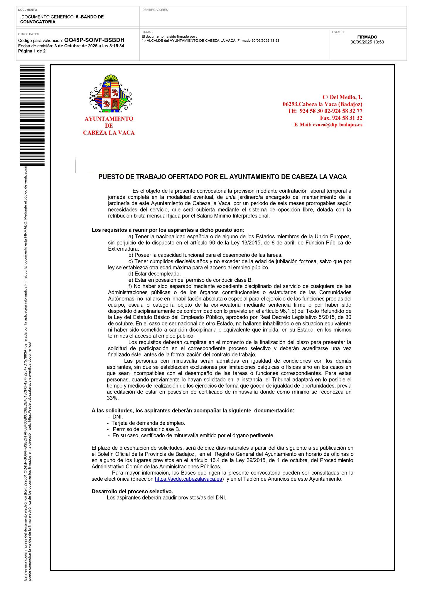 El Ayuntamiento convoca una plaza temporal de jardinero/a a jornada completa. Contrato de seis meses (prorrogables) con retribución según el SMI. Requisitos: desempleo, permiso de conducir B y demás condiciones legales.