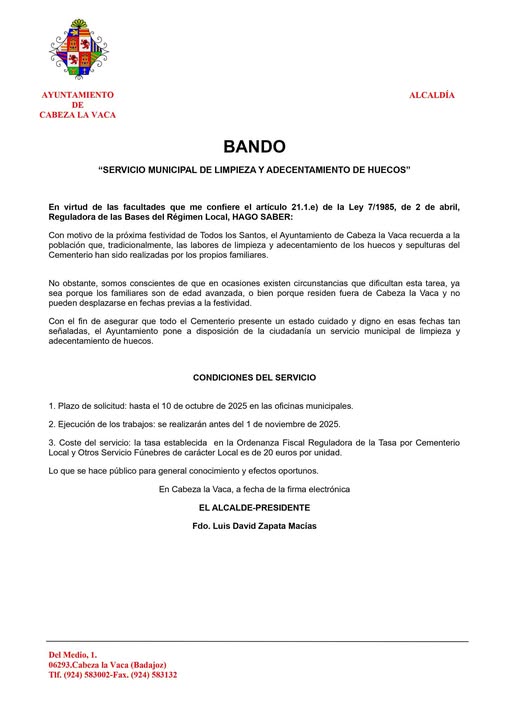 Con motivo de la festividad de Todos los Santos, el Ayuntamiento de Cabeza la Vaca pone a disposición de la ciudadanía un servicio de limpieza y adecentamiento de huecos y sepulturas.