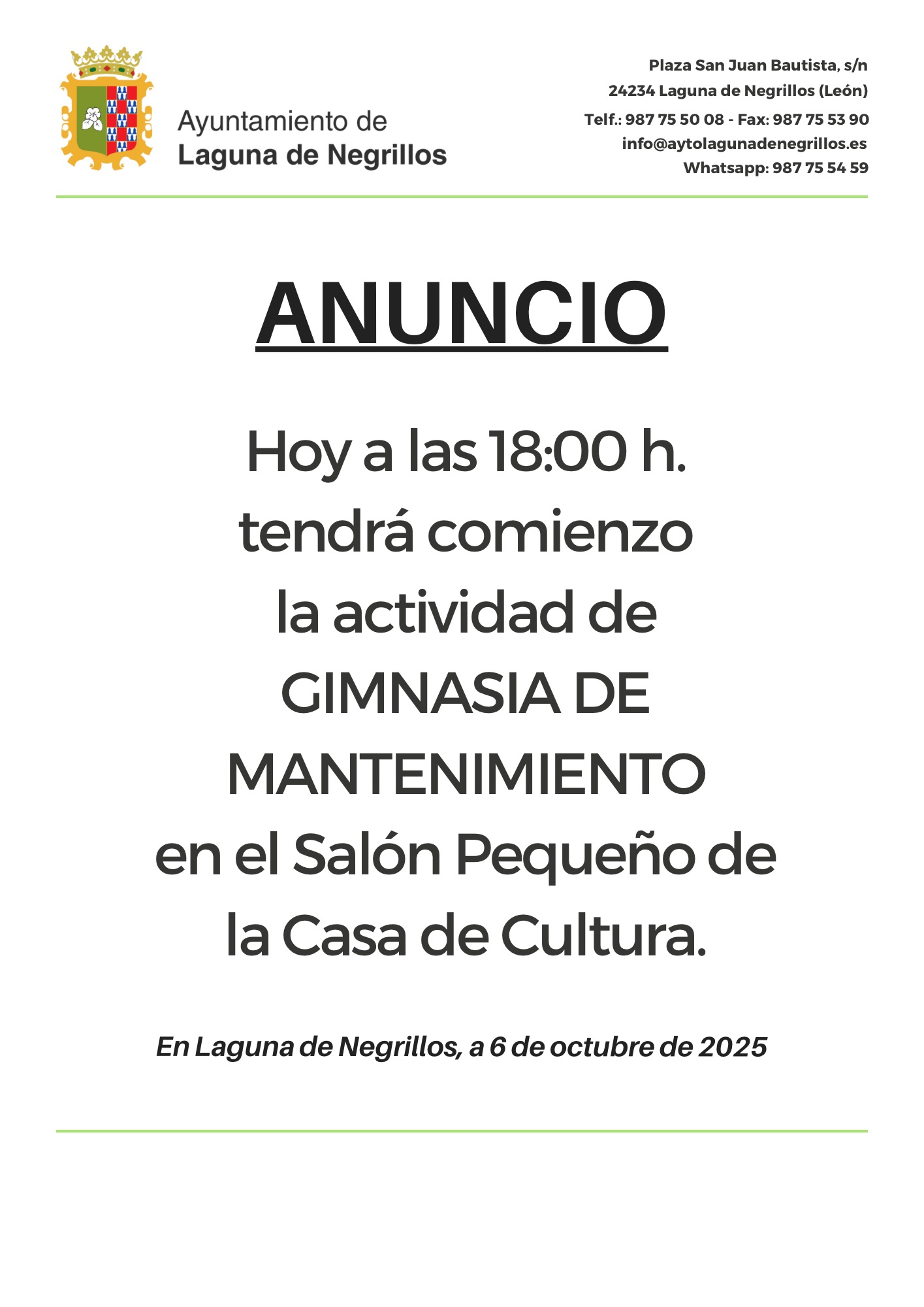 Hoy a las 18:00 h. tendrá comienzo la actividad de GIMNASIA DE MANTENIMIENTO en el Salón Pequeño de la Casa de Cultura.