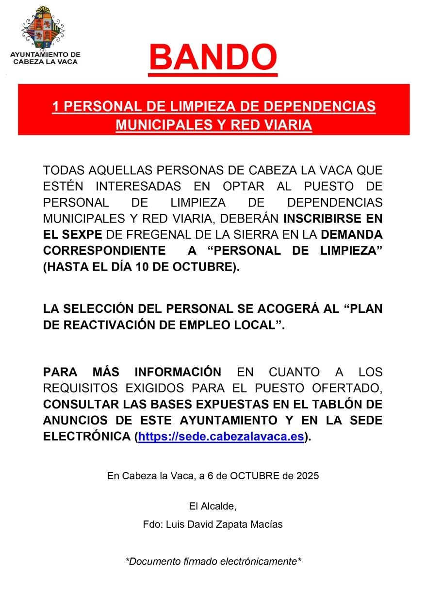 El Ayuntamiento de Cabeza la Vaca informa que se encuentra abierto el plazo de inscripción para optar al puesto de personal de limpieza de dependencias municipales y red viaria, dentro del Plan de Reactivación de Empleo Local.