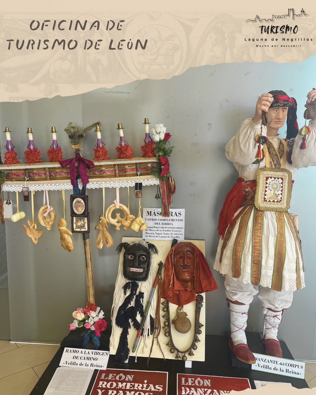 Estamos representados con la máscara negra de nuestros queridos birrias. Además, también se muestran otros elementos significativos, como el danzante del Corpus de Velilla de la Reina, reflejando la riqueza y diversidad de nuestras tradiciones populares.