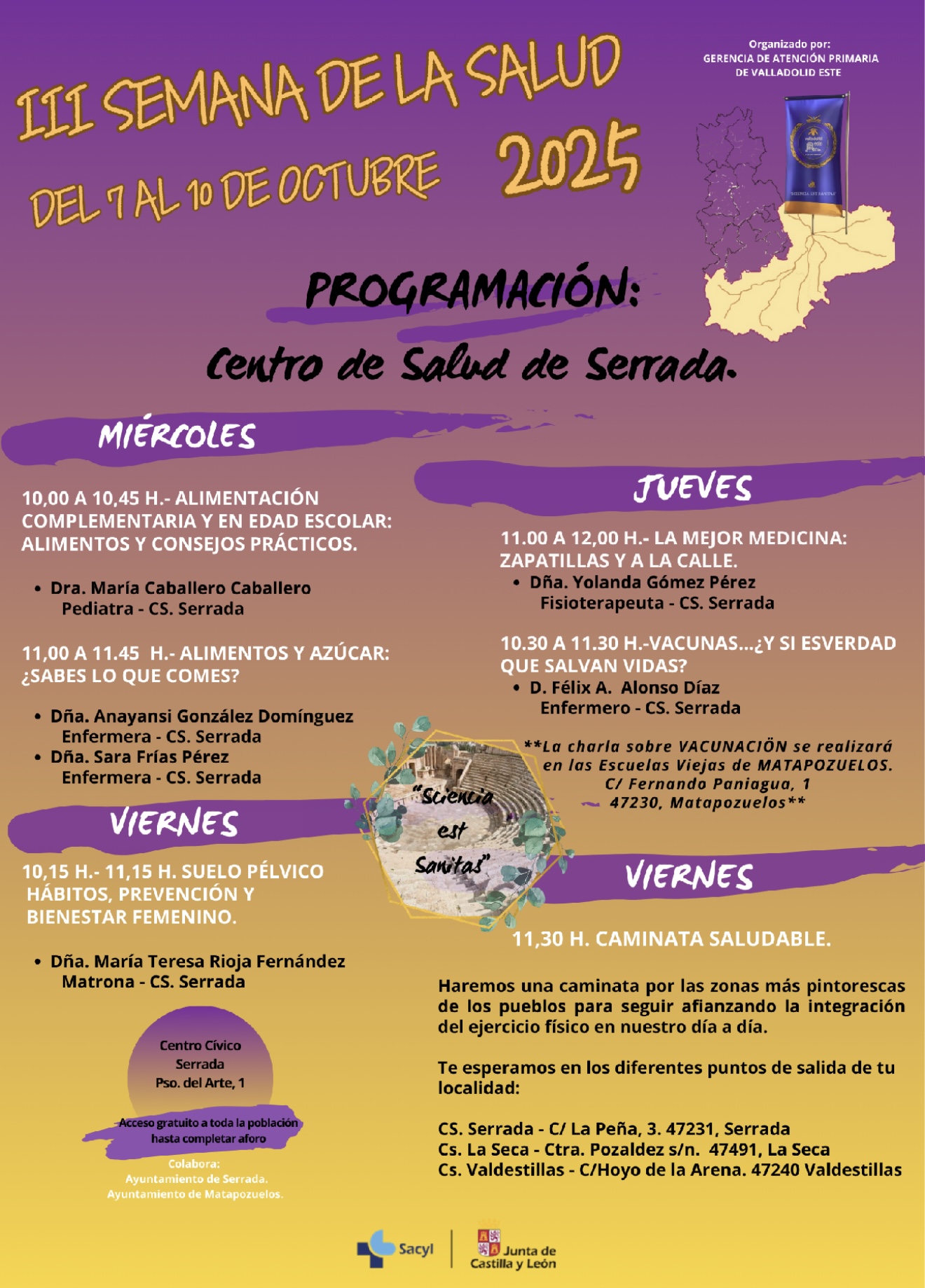 Para la zona de Serrada, el Centro de Salud de Serrada ha programado unas actividades para la semana del 7 al 10 de octubre sobre Salud, todas aquellas personas interesadas ver cartel adjunto