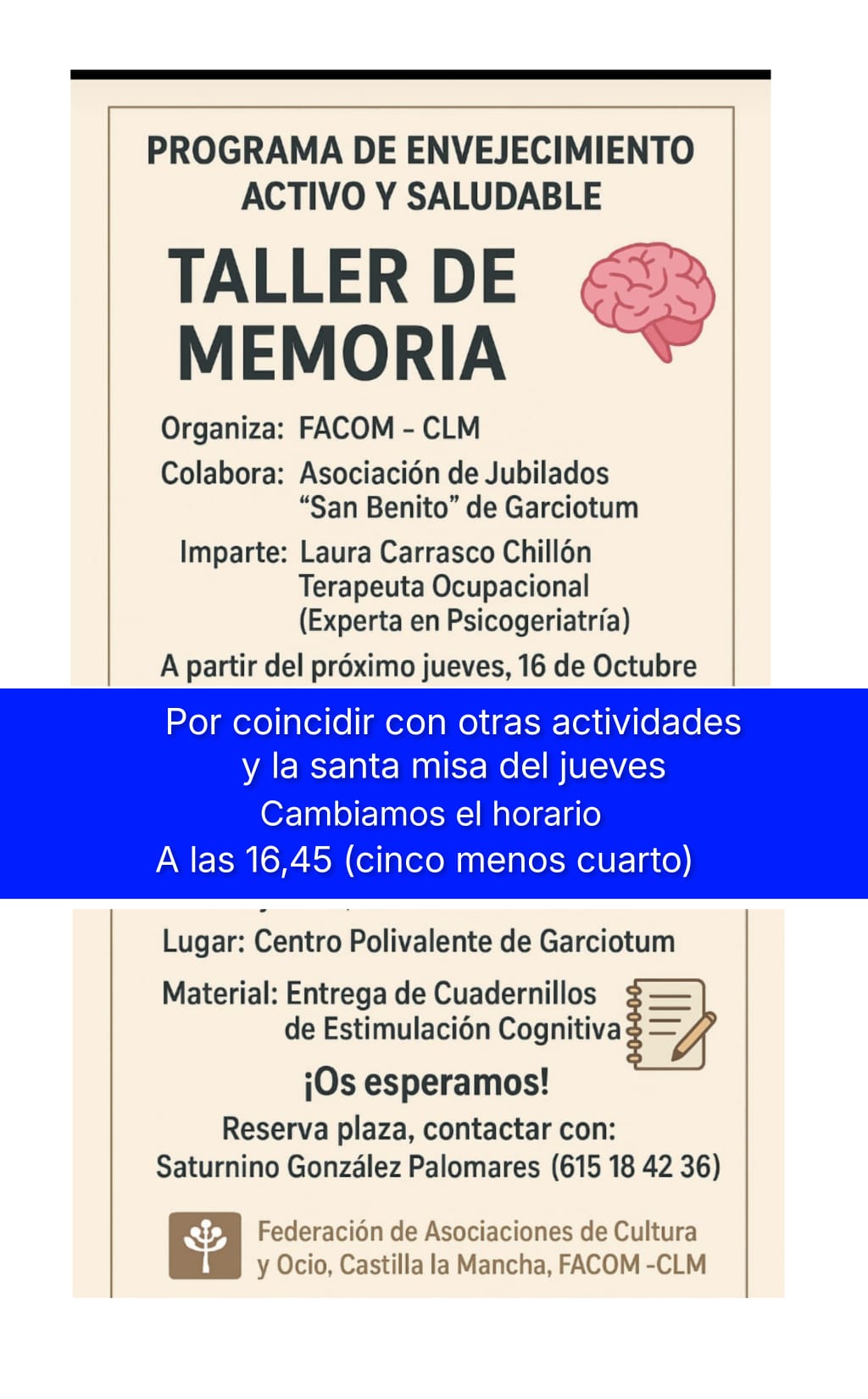 Dentro del Programa de Envejecimiento Activo y Saludable se organiza un taller de memoria dirigido a personas mayores y a quienes deseen mejorar y mantener sus capacidades cognitivas.