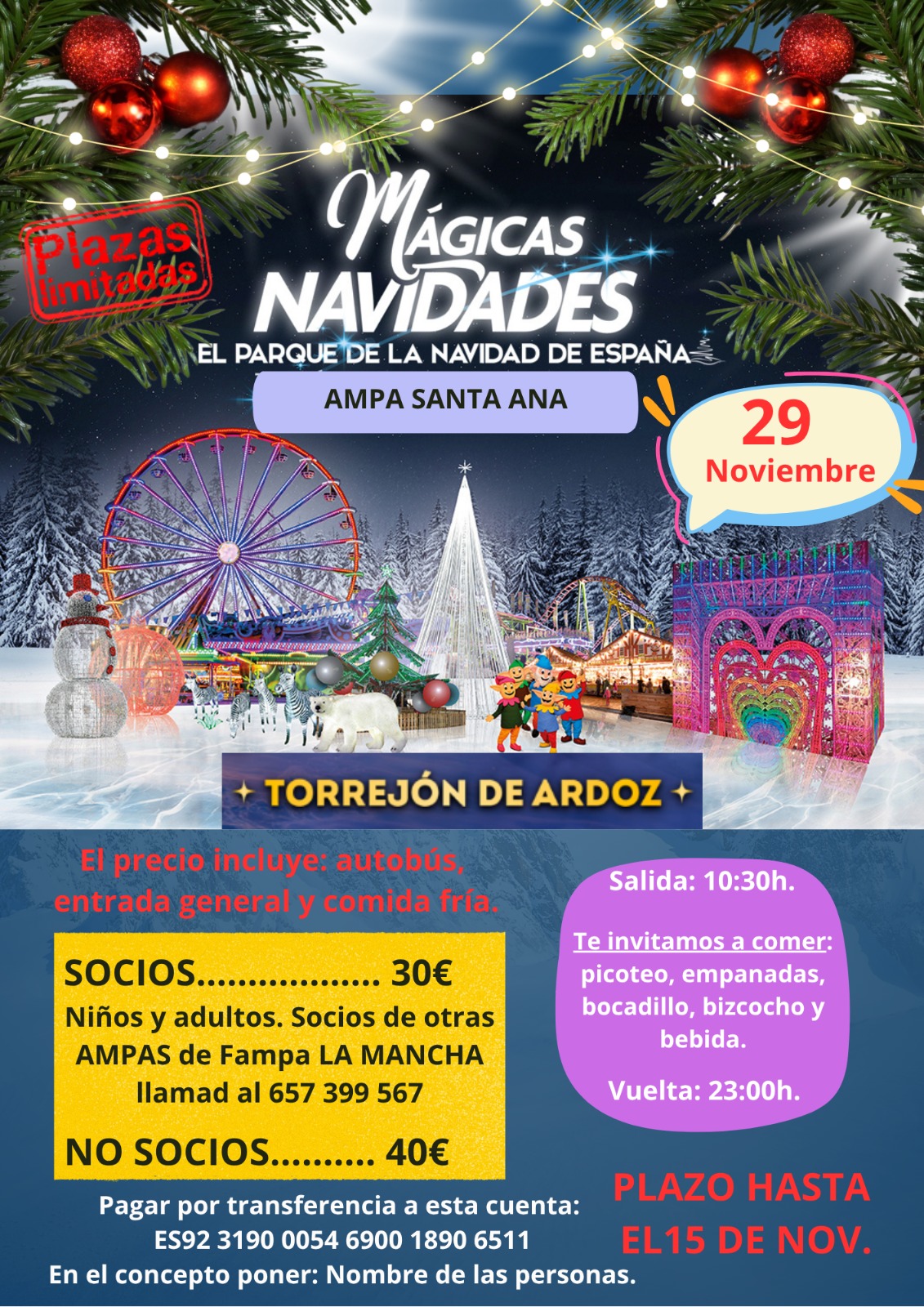 A.M.P.A. "Santa Ana" informa: Viaje a Torrejón de Ardoz al Parque de la Navidad el 29 de noviembre. Inscripciones hasta el 15 de noviembre, más información en el cartel adjunto.