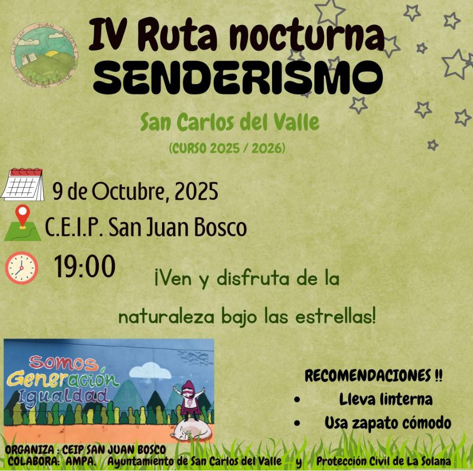 El C.E.I.P. San Juan Bosco organiza la IV Ruta Nocturna de Senderismo, será esta tarde a las 19h. Ven y disfruta de la naturaleza bajo las estrellas.