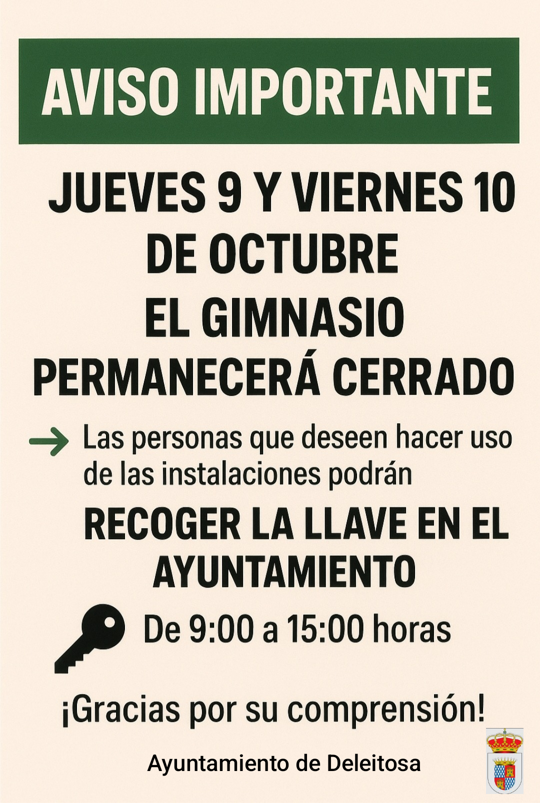 📅 JUEVES 9 Y VIERNES 10 DE OCTUBRE 🏋️♂️ EL GIMNASIO PERMANECERÁ CERRADO ➡️ Las personas que deseen hacer uso de las instalaciones podrán RECOGER LA LLAVE EN EL AYUNTAMIENTO 🕘 De 9:00 a 15:00 horas 🙏 ¡Gracias por su comprensión!