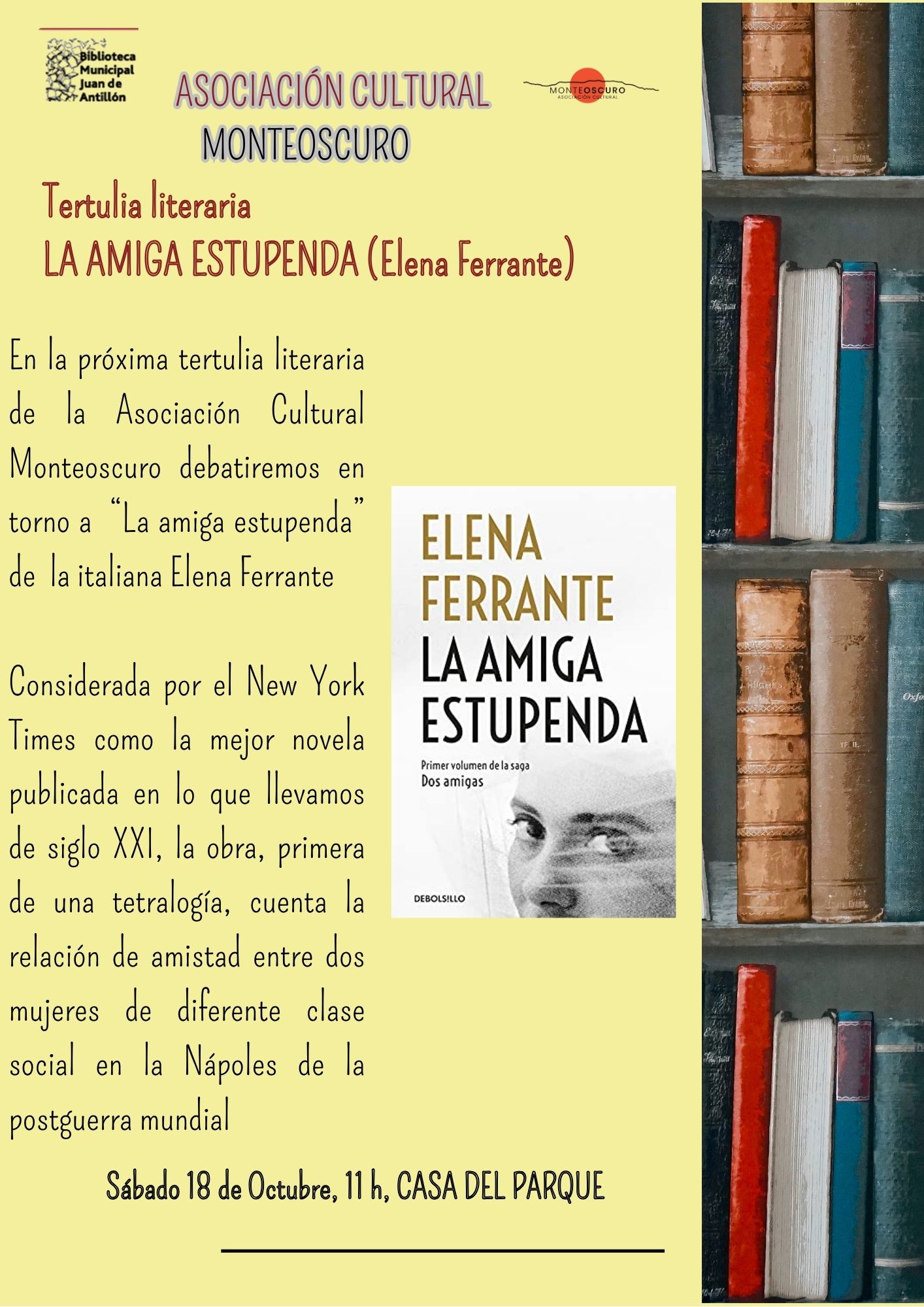 El sábado 18 de octubre a las 11:00 horas, en la Casa del Parque, se inaugurará la temporada de tertulias literarias en el grupo de lectura de la Asociación Cultural Monteoscuro. Se comentará el libro La amiga estupenda, de Elena Ferrante.