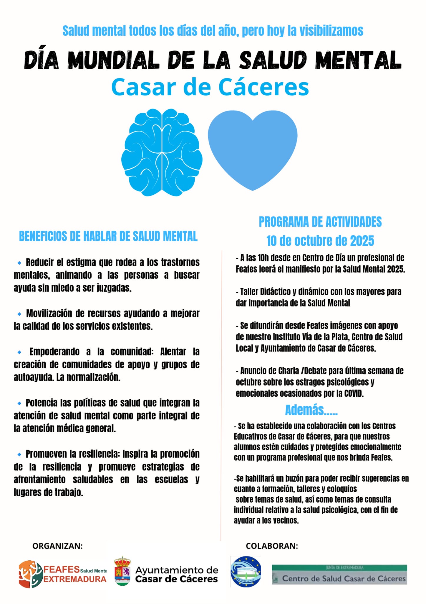 🩵 La Salud Mental es todo los días del año, pero mañana 10 de octubre la visibilizamos.👇🏼👇🏼👇🏼- Beneficios de hablar de la salud mental.- Programa de actividades.#casardecaceres