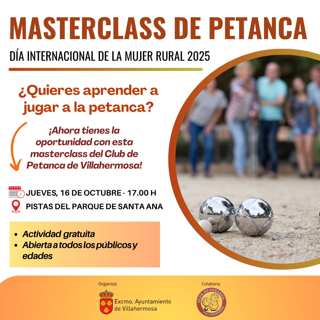 El Ayuntamiento de Villahermosa, en colaboración con el Club de Petanca de Villahermosa, organiza una masterclass de petanca con motivo del Día Internacional de la Mujer Rural.