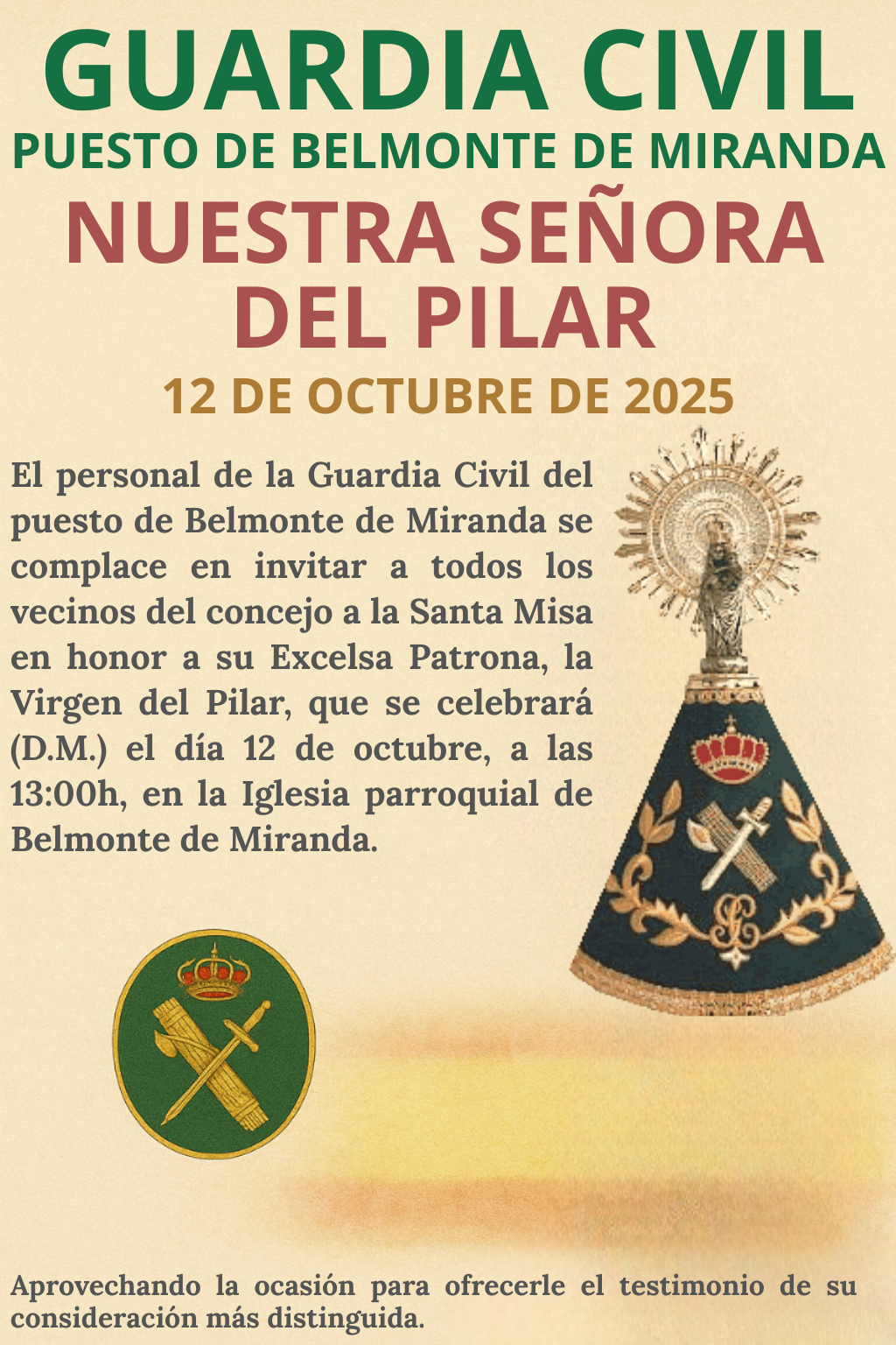 El personal de la Guardia Civil del puesto de Belmonte de Miranda se complace en invitar a todos los vecinos del concejo a la Santa Misa en honor a su Excelsa Patrona, la Virgen del Pilar, que se celebrará (D.M.) el día 12 de octubre, a las 13:00h, en la Iglesia parroquial de Belmonte de Miranda.