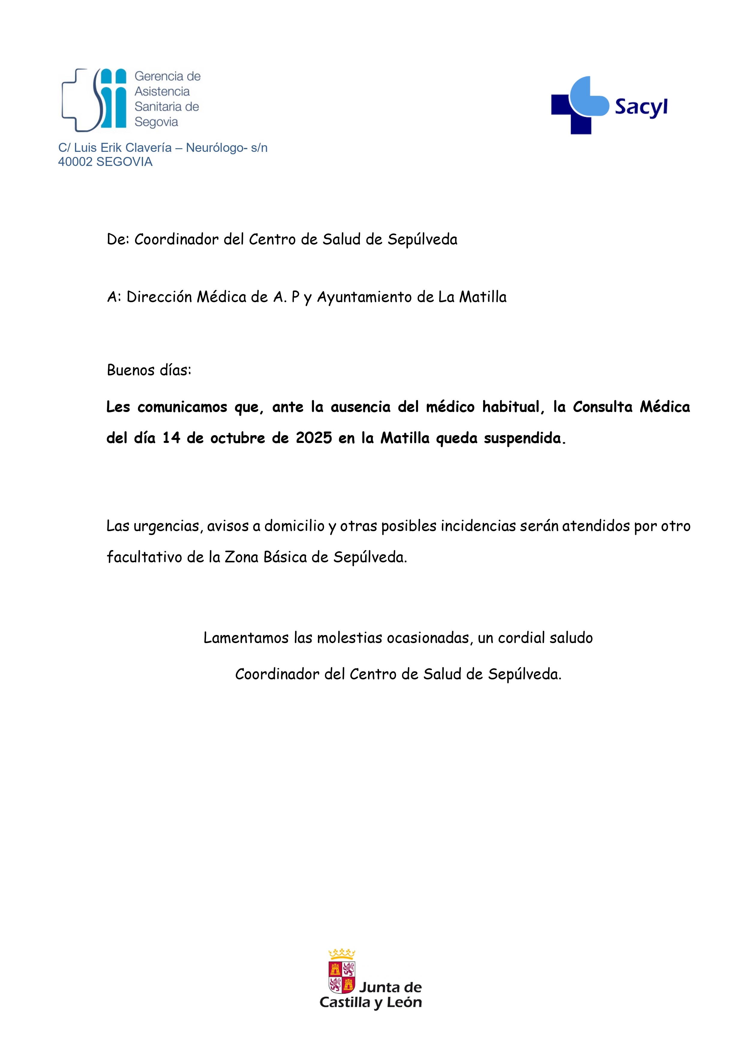 Se informa a los vecinos que, debido a la ausencia del médico habitual, la consulta médica prevista para el martes 14 de octubre de 2025 queda suspendida.