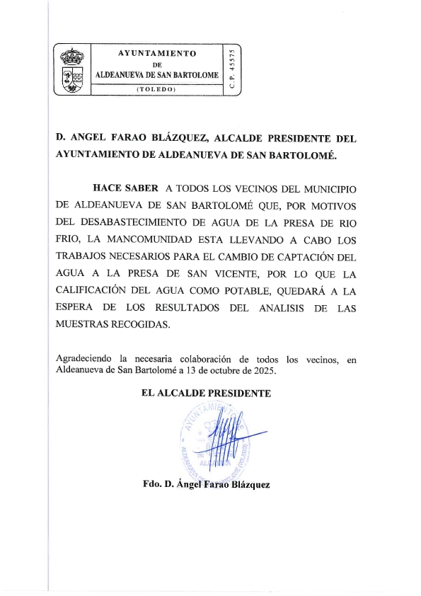 se adjunta el Bando del cambio de captación del agua.