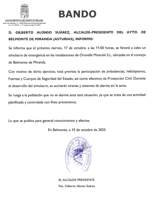 Se informa que el próximo viernes, 17 de octubre, a las 11:00 horas, se llevará a cabo un simulacro de emergencia en las instalaciones de Orovalle Minerals S.L. ubicadas en el concejo de Belmonte de Miranda.