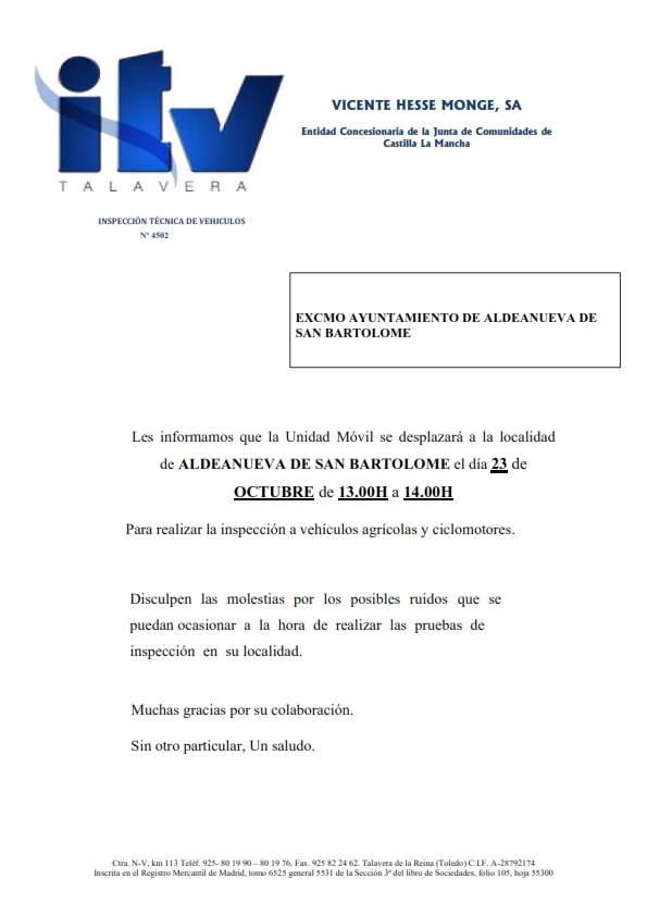 Les informaremos de que la unidad móvil de la ITV estará en Aldeanueva de San Bartolomé el día 23 de octubre de 13:00 a 14:00 horas para vehículos agrícolas y ciclomotores.Se adjunta documento informativo.