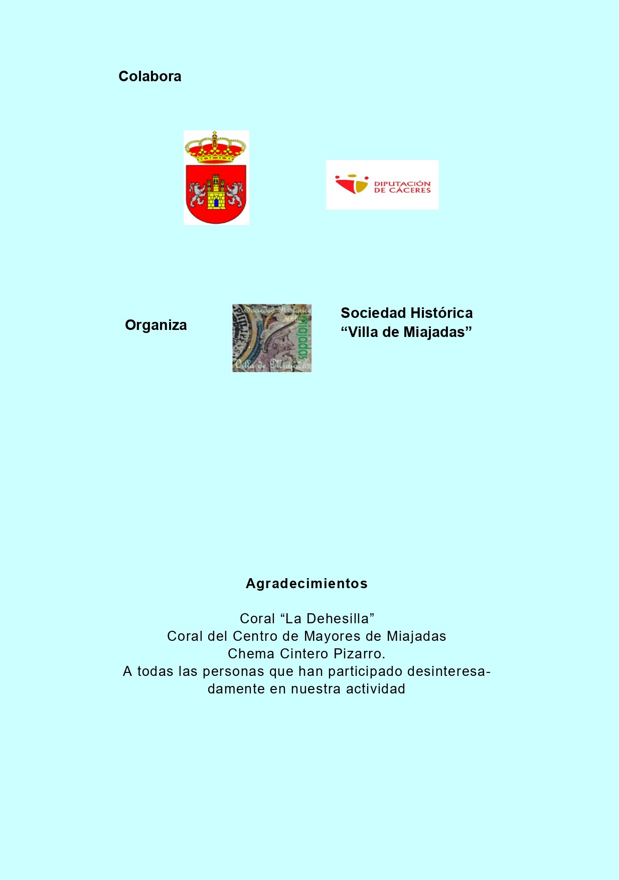 *** Con la colaboración del Ayuntamiento de Miajadas y la Diputación de Cáceres; así como la participación de la Coral “La Dehesilla”, el Centro de Mayores de Miajadas y Chema Cintero Pizarro, entre otras personas que participarán en dicha actividad de forma desinteresada.