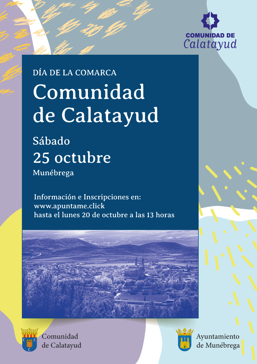 Buenos días, se comunica que el día 25 de octubre se celebrará el Día de la Comarca en Munebrega. El enlace para apuntarse lo ponemos al final de este texto y para facilitar la inscripción, estaremos en el Ayuntamiento mañana viernes 17 de octubre y el lunes, día 20 entre las 11 y las 13 h.