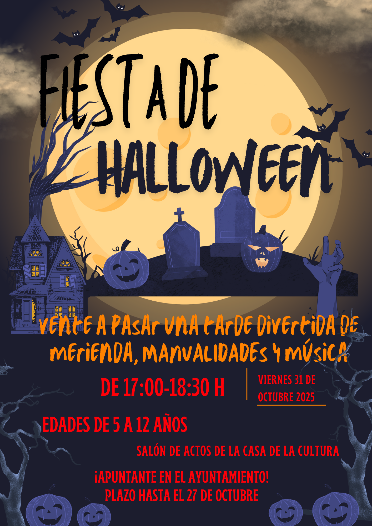 El Ayuntamiento informa a las familias que el viernes, 31 de octubre, se celebrará una tarde de Halloween para niñas y niños de 5 a 12 años. Habrá merienda, manualidades y música en el salón de la Casa de la Cultura.