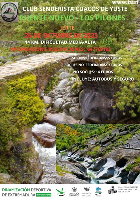 Está abierto el plazo de inscripción para la ruta senderista Puente Nuevo - Los Pilones (Jerte), que se celebrará el domingo, 26 de octubre de 2025.