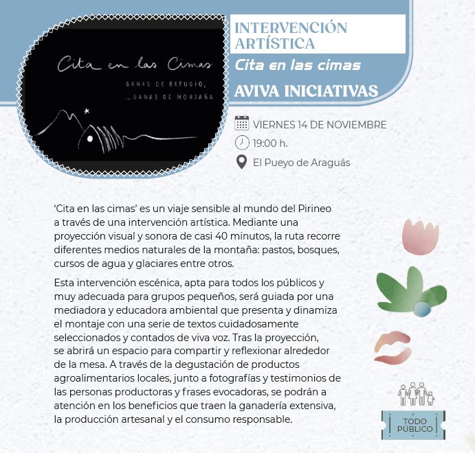 ‘Cita en las cimas’ es un viaje sensible al mundo del Pirineo a través de una intervención artística. Mediante una proyección visual y sonora de casi 40 minutos, la ruta recorre diferentes medios naturales de la montaña: pastos, bosques, cursos de agua y glaciares entre otros. Esta intervención escénica, apta para todos los públicos y muy adecuada para grupos pequeños, será guiada por una mediadora y educadora ambiental que presenta y dinamiza el montaje con una serie de textos cuidadosamente seleccionados y contados de viva voz. Tras la proyección, se abrirá un espacio para compartir y reflexionar alrededor de la mesa. A través de la degustación de productos agroalimentarios locales, junto a fotografías y testimonios de las personas productoras y frases evocadoras, se podrán a atención en los beneficios que traen la ganadería extensiva, la producción artesanal y el consumo responsable.