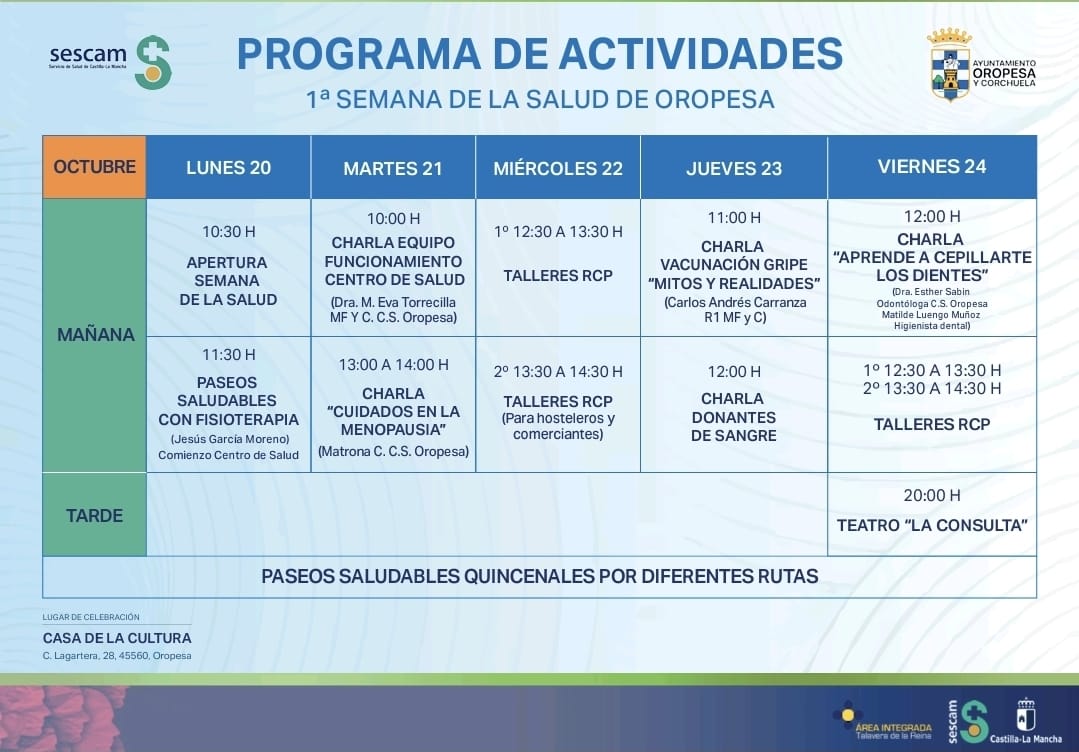 📢 🩸 1ª SEMANA DE LA SALUD ❣️ PROGRAMA DE ACTIVIDADES👩💻📆 Del 20 al 24 octubre 2025🏟️ Casa de la Cultura Oropesa