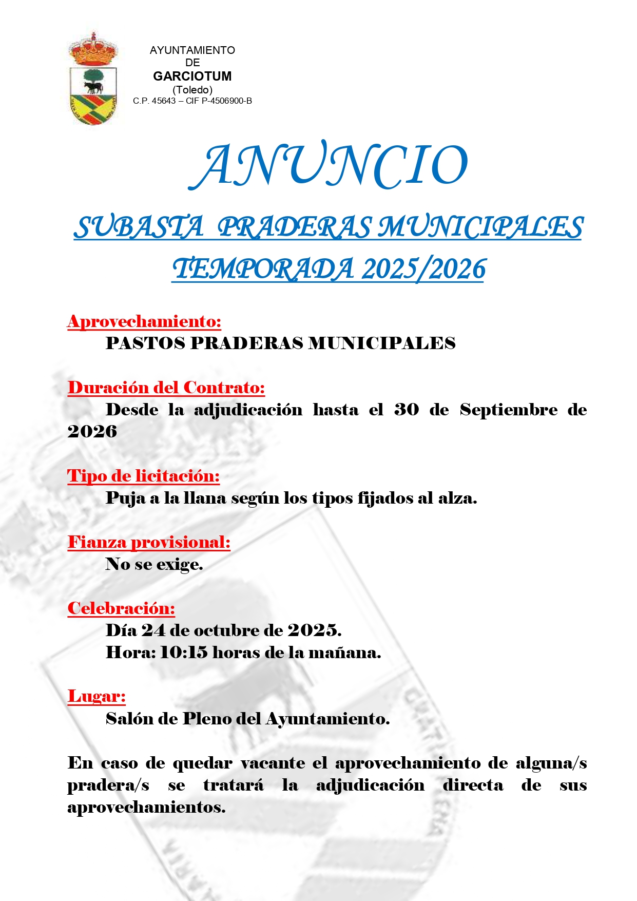 SUBASTA PRADERAS MUNICIPALES TEMPORADA 2025/2026 Aprovechamiento: PASTOS PRADERAS MUNICIPALES