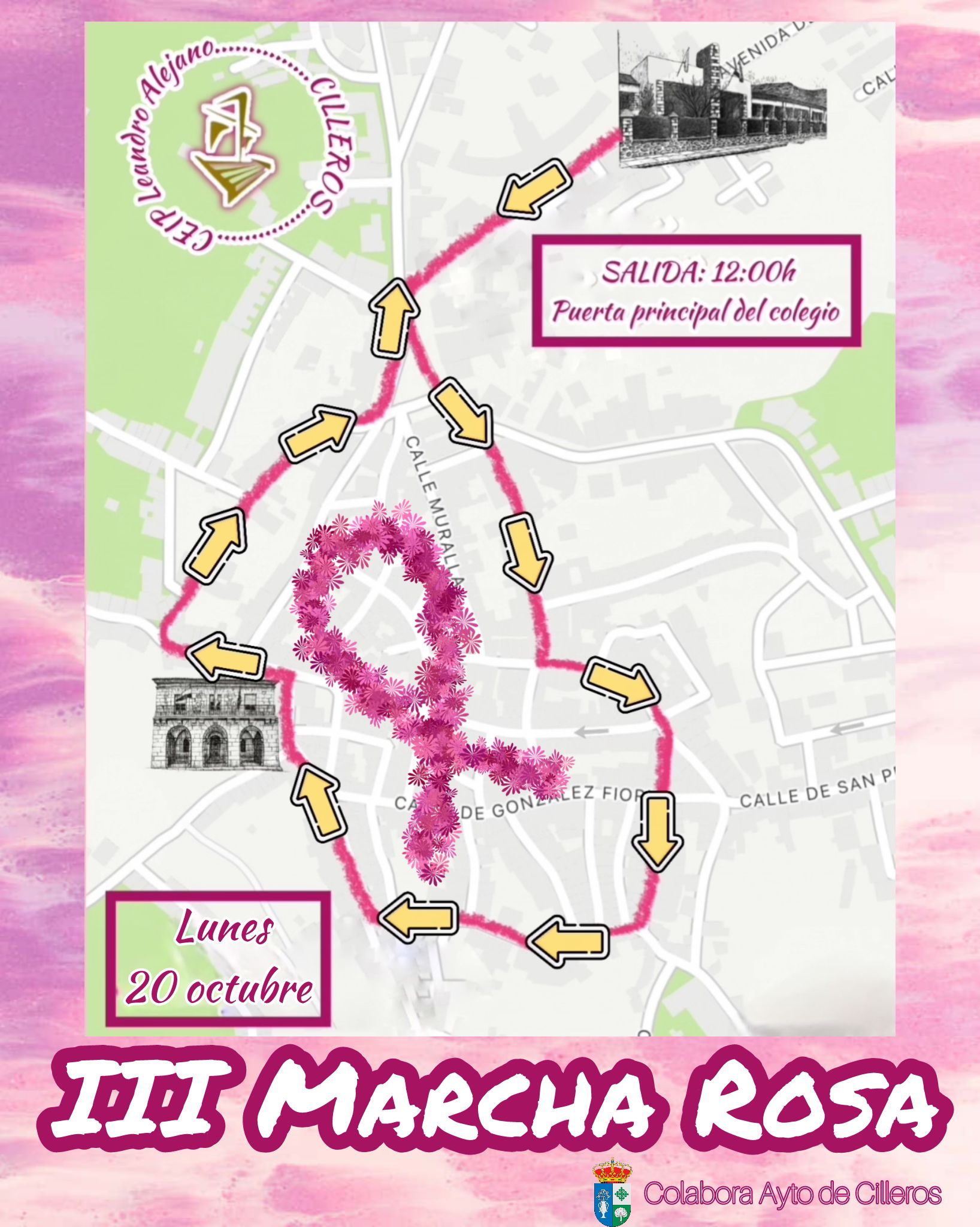 EL C.E.I.P. LEANDRO ALEJANO DE CILLEROS INFORMA:MAÑANA LUNES DÍA 20 DE OCTUBRE, SI LA METEOROLOGÍA ACOMPAÑASE CELEBRARÁ LA III MARCHA ROSA EL COLEGIO ANIMA A TODAS LAS PERSONAS QUE QUIERAN ACOMPAÑAR EN SU RECORRIDO.
