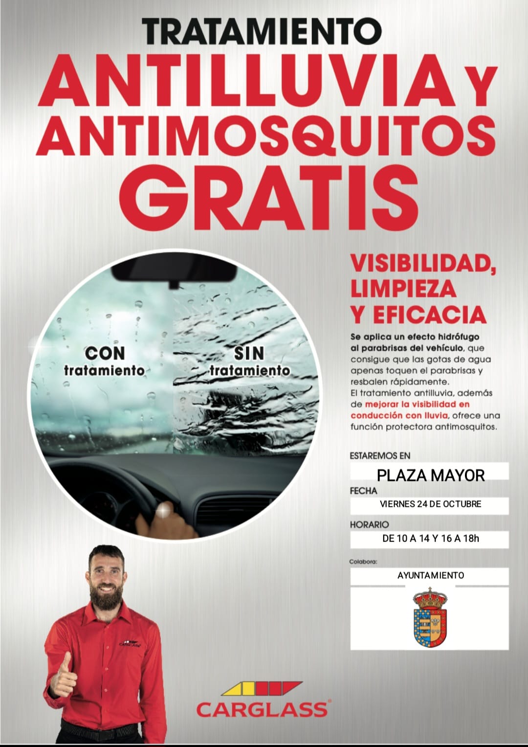 AVISO, EL PRÓXIMO DÍA 24 DE OCTUBRE EN LA PLAZA MAYOR LA EMPRESA CARGLASS REALIZARÁ EL TRATAMIENTO ANTILLUVIA Y ANTIMOSQUITOS PARA TODOS AQUELLOS QUE QUIERAN LLEVAR SUS VEHICULOS. (Ver cartel adjunto).