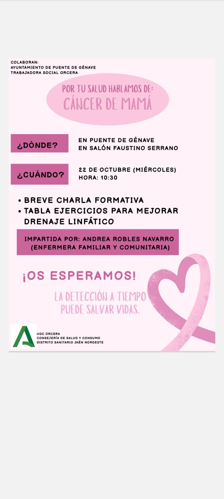El pr贸ximo mi茅rcoles 22 de octubre, a las 10:30 h, te esperamos en el Sal贸n Faustino Serrano de Puente de G茅nave para participar en una breve charla formativa sobre la prevenci贸n y el cuidado en el c谩ncer de mama.