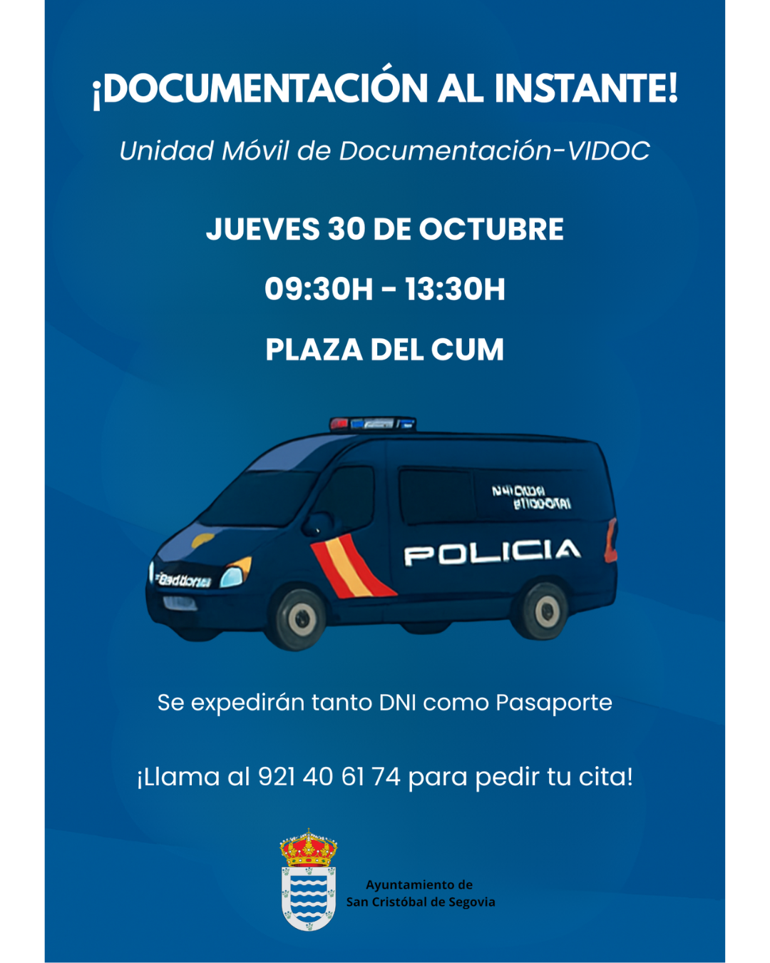 Contaremos con la Unidad Móvil de Documentación-VIDOC de la Comisaría Provincial en nuestro municipio. Tendrá lugar el próximo jueves 30 de octubre en la Plaza del CUM de 09:30h a 13:30h.