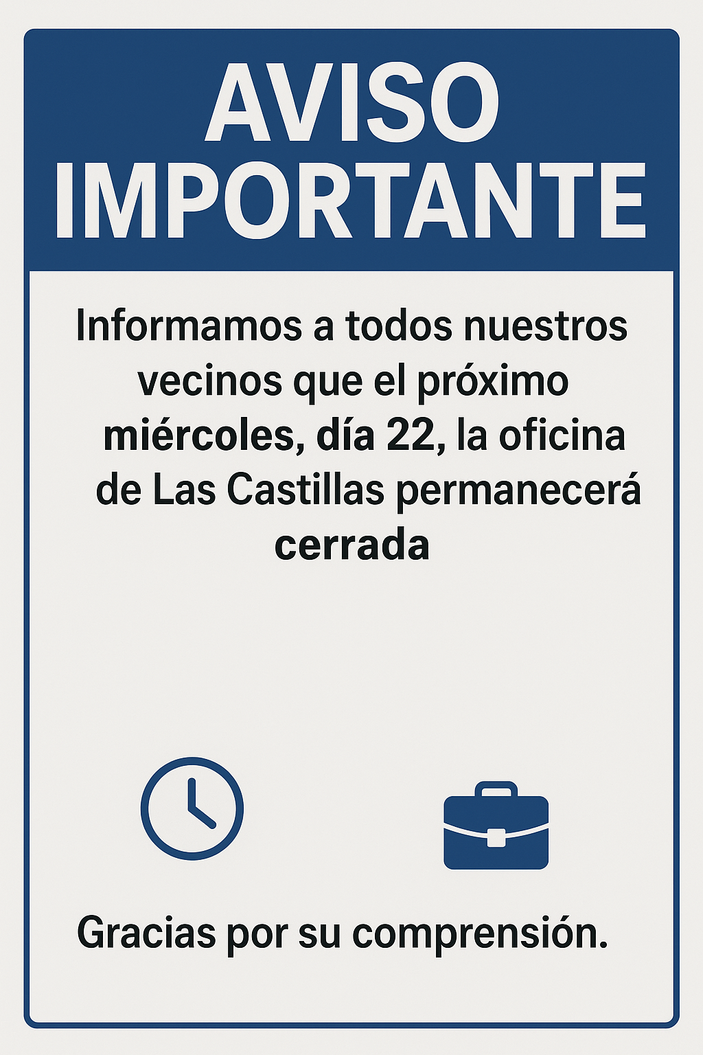 Informamos que el próximo miércoles, día 22, la oficina de Las Castillas permanecerá cerrada.