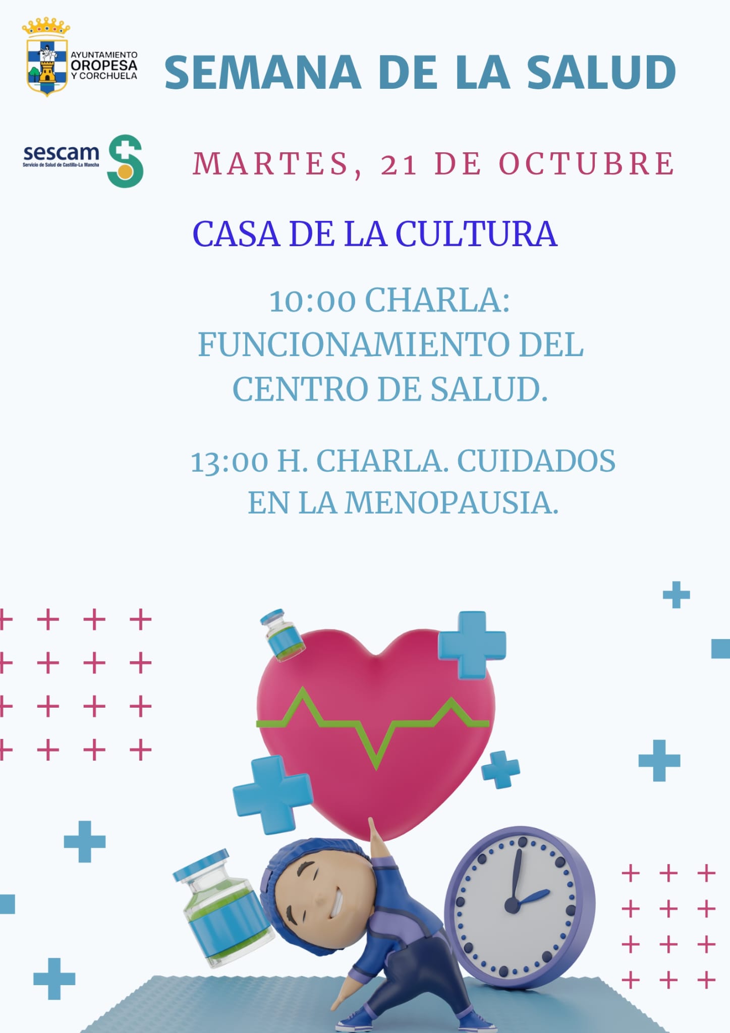 PARA TODOS LOS PÚBLICOS📆Martes 21 de octubre⏳10:00 h. Charla. Funcionamiento del Centro de Salud en Casa de la Cultura🏟️🕦 13:00 h . Charla. Cuidados en la Menopausia en Casa de la Cultura 🏟️