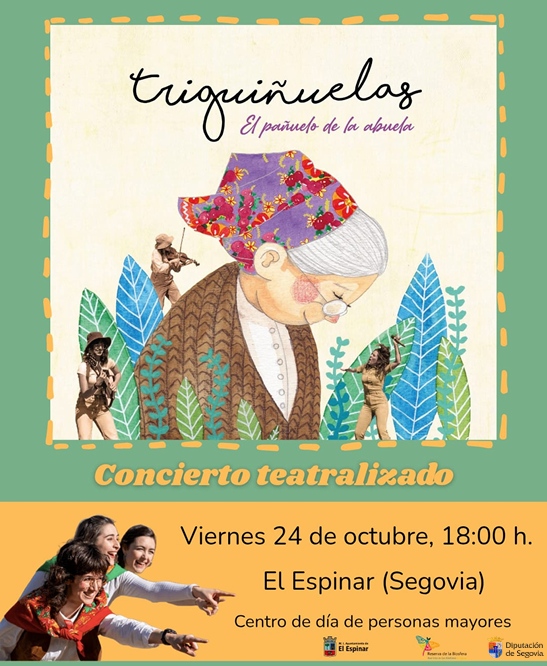 El próximo VIERNES 24 DE OCTUBRE, a las 18.00h. en el Centro de día de Personas Mayores de El Espinar se representará “El Pañuelo de la Abuela”, un concierto teatralizado donde tres musiexploradoras son las encargadas de poner en valor los oficios tradicionales de las mujeres y guiar a los más pequeños, por medio de canciones y una trepidante historia a descubrir. No te lo pierdas!! Programa “Lo Aprendí de los abuelos” de la Diputación