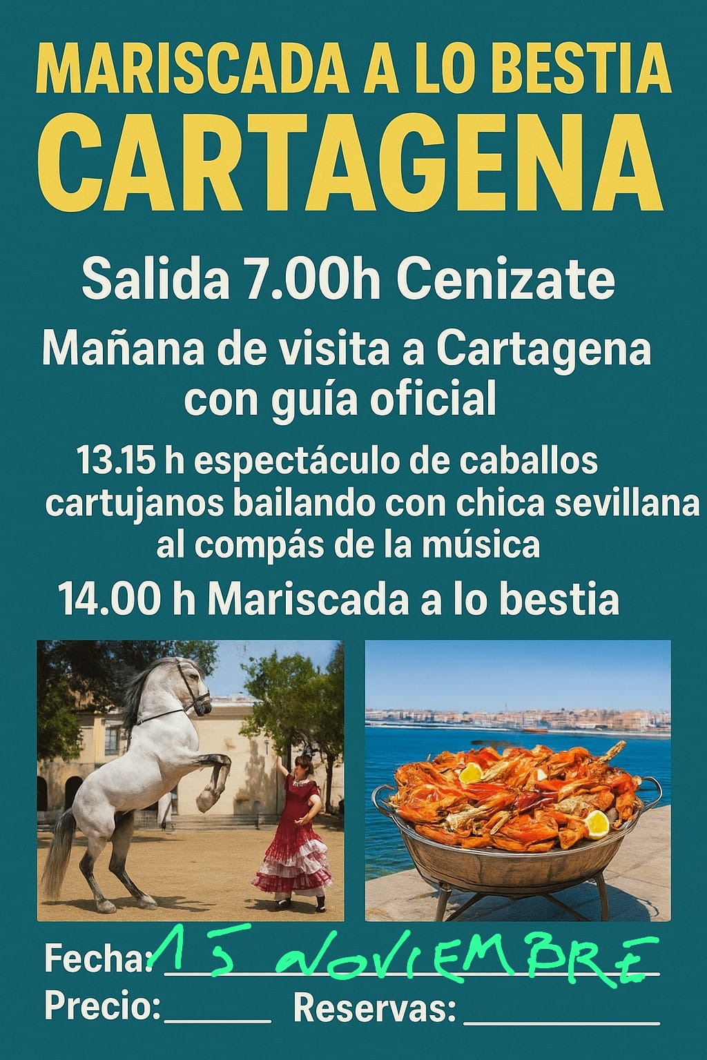 La Asociación de jubilados y pensionistas "San Isidro" de Cenizate Organiza una viaje a Cartagena para el dia 15 de noviembre de 2025 (ida y vuelta el mismo día) para una MARISCADA.