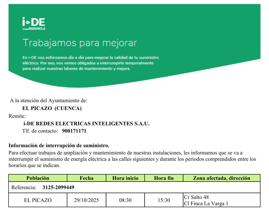 interrumpir el suministro de energía eléctrica a las calles siguientes y durante los periodos comprendidos entre los horarios que se indican: