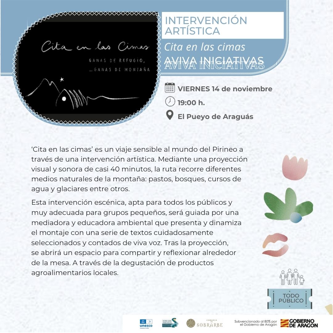 'Cita en as cimas' es un viaje sensible al mundo del Pirineo a través de una intervención artística. Mediante una protección visual y sonora de casi 40 minutos, la ruta recorre diferentes medios naturales de la montaña: pastos, bosques, cursos de agua y glaciares entre otros.