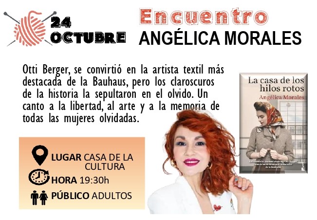 Os recordamos que esta tarde tenemos un encuentro literairo a las 19:30 h. en la Casa de cultura, con la escritora ANGELICA MORALES ; hablaremos de "La casa de los hilos rotos" y del desconocido personaje histórico que la protagoniza, Otti Berger, un mujer sorprendente que triunfó con sus diseños textiles en el periodo de entreguerras.