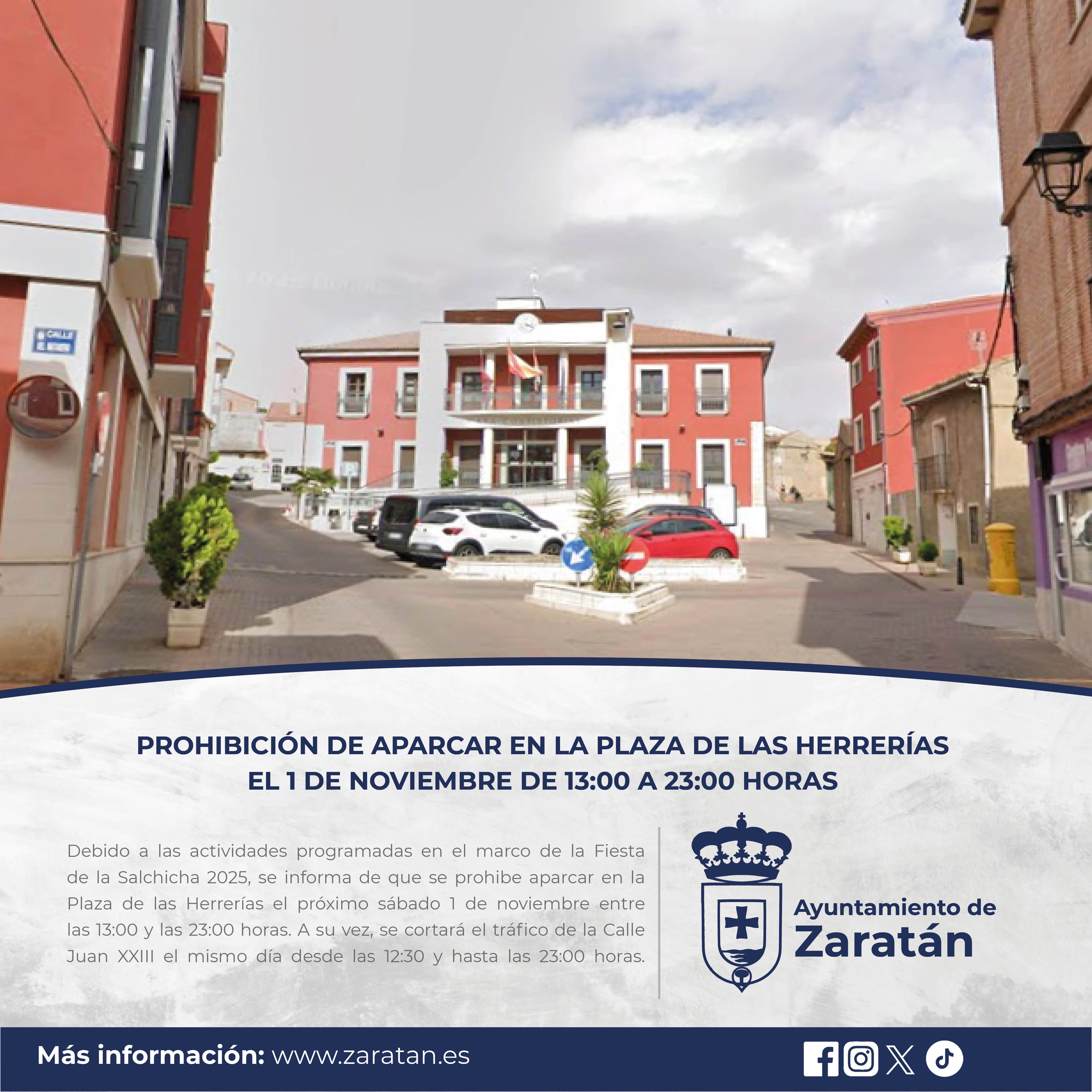 Debido a las actividades programadas en el marco de la Fiesta de la Salchicha 2025, se informa de que se prohibe aparcar en la Plaza de las Herrerías el próximo sábado 1 de noviembre entre las 13:00 y las 23:00 horas. A su vez, se cortará el tráfico de la Calle Juan XXIII el mismo día desde las 12:30 y hasta las 23:00 horas.