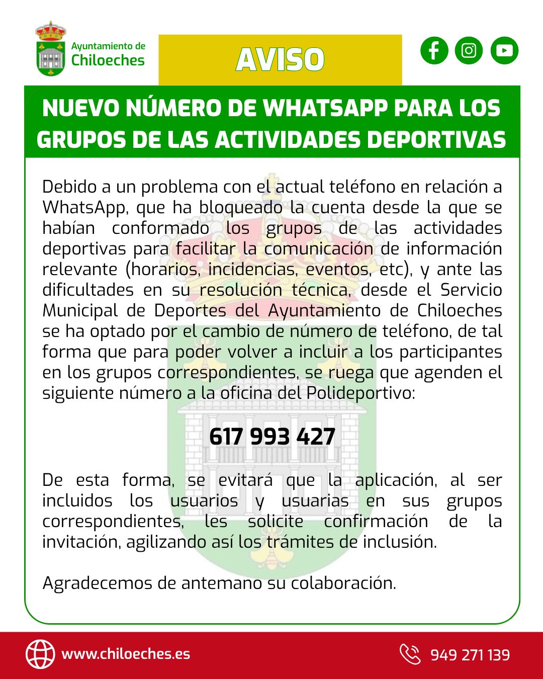 Debido a un problema con el actual teléfono en relación a WhatsApp, que ha bloqueado la cuenta desde la que se habían conformado los grupos de las actividades deportivas para facilitar la comunicación de información relevante (horarios, incidencias, eventos, etc), y ante las dificultades en su resolución técnica, desde el Servicio Municipal de Deportes del Ayuntamiento de Chiloeches se ha optado por el cambio de número de teléfono, de tal forma que para poder volver a incluir a los participantes en los grupos correspondientes, se ruega que agenden el siguiente número a la oficina del Polideportivo: