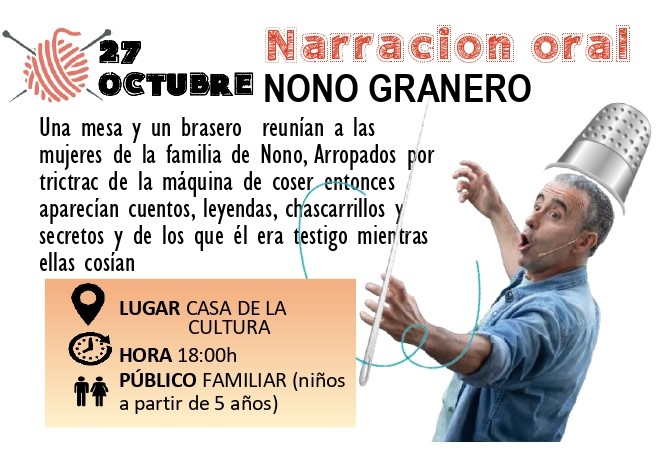 No te pierdas el cuentacuentos familiar de esta tarde con NONO GRANERO, para niñ@s a partir de 5 años, vente a la Casa de cultura a las 18:00 h. para disfrutar de una buena "tanda" de historias que despierte la imaginación de los peques.