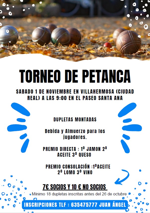 El Club de Petanca de Villahermosa organiza un nuevo Torneo de Petanca el sábado 1 de noviembre, a partir de las 9:00 h en el Paseo Santa Ana.