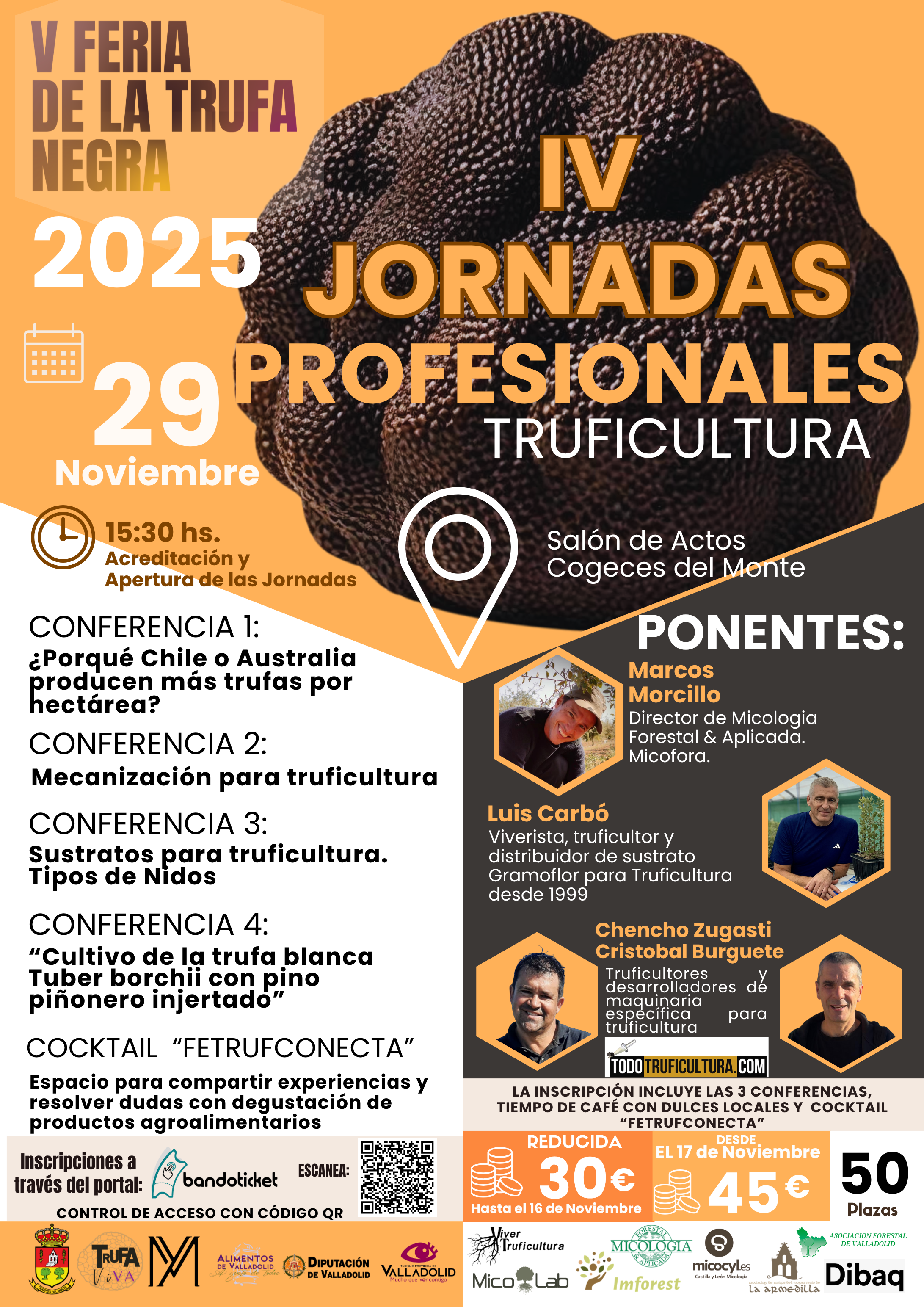 Después de la experiencia tan positiva de las tres ediciones anteriores, en el 2025 volvemos a apostar por unas jornadas profesionales de truficultura como un punto de encuentro de profesionales del sector y un referente a nivel nacional (ver cartel adjunto).